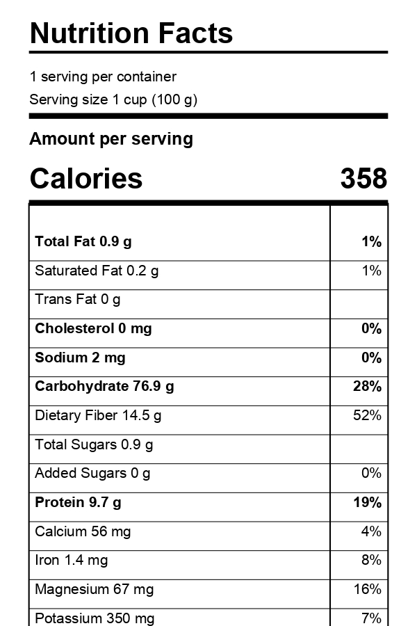 * Clean Energy: It offers a total of 470 Cal per 100g, providing sustained energy with only 30mg of Sodium and 0nmg of Cholesterol.
